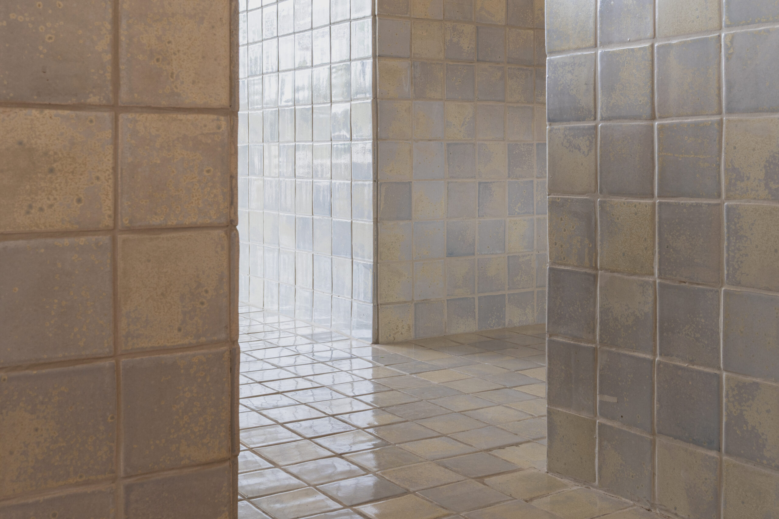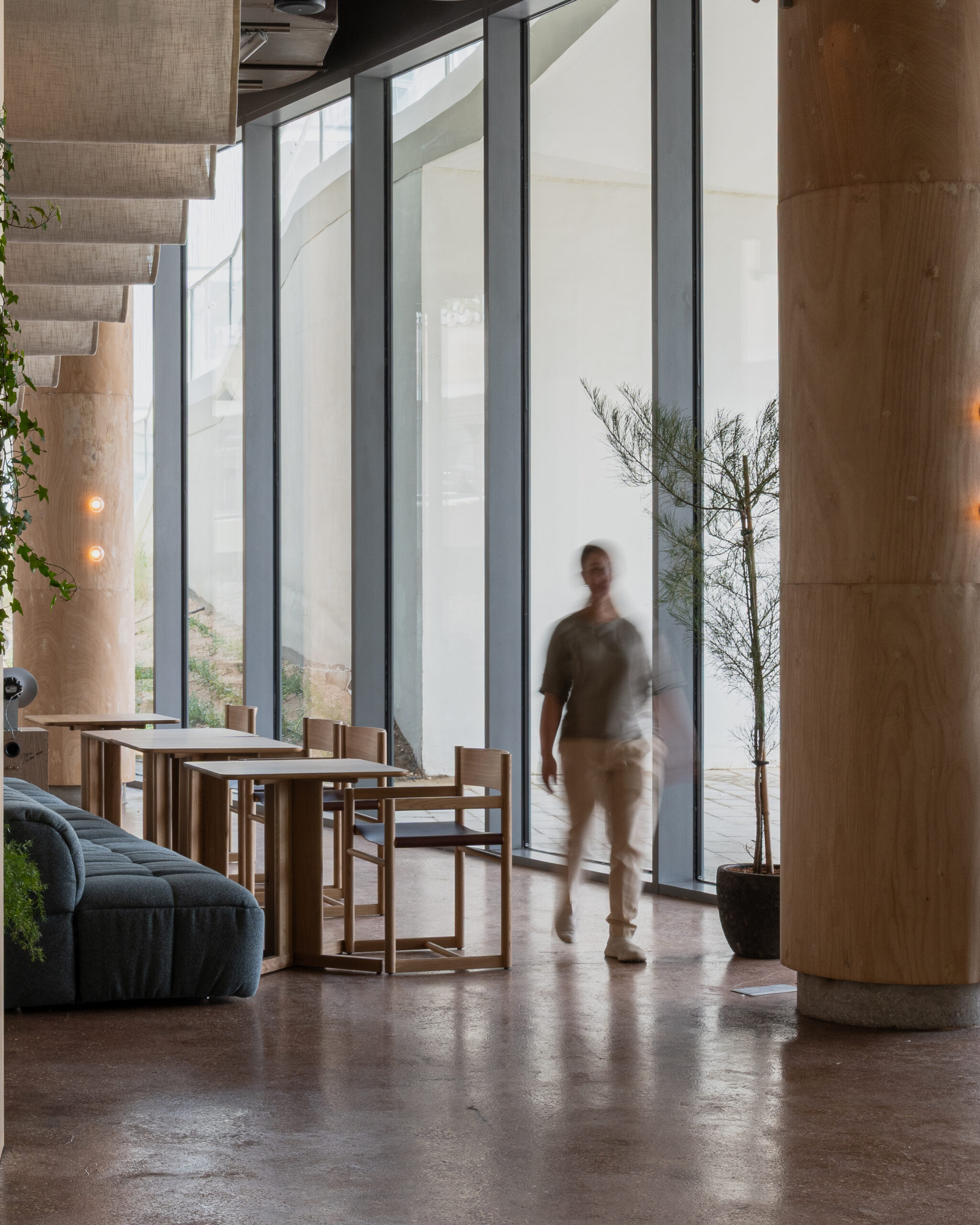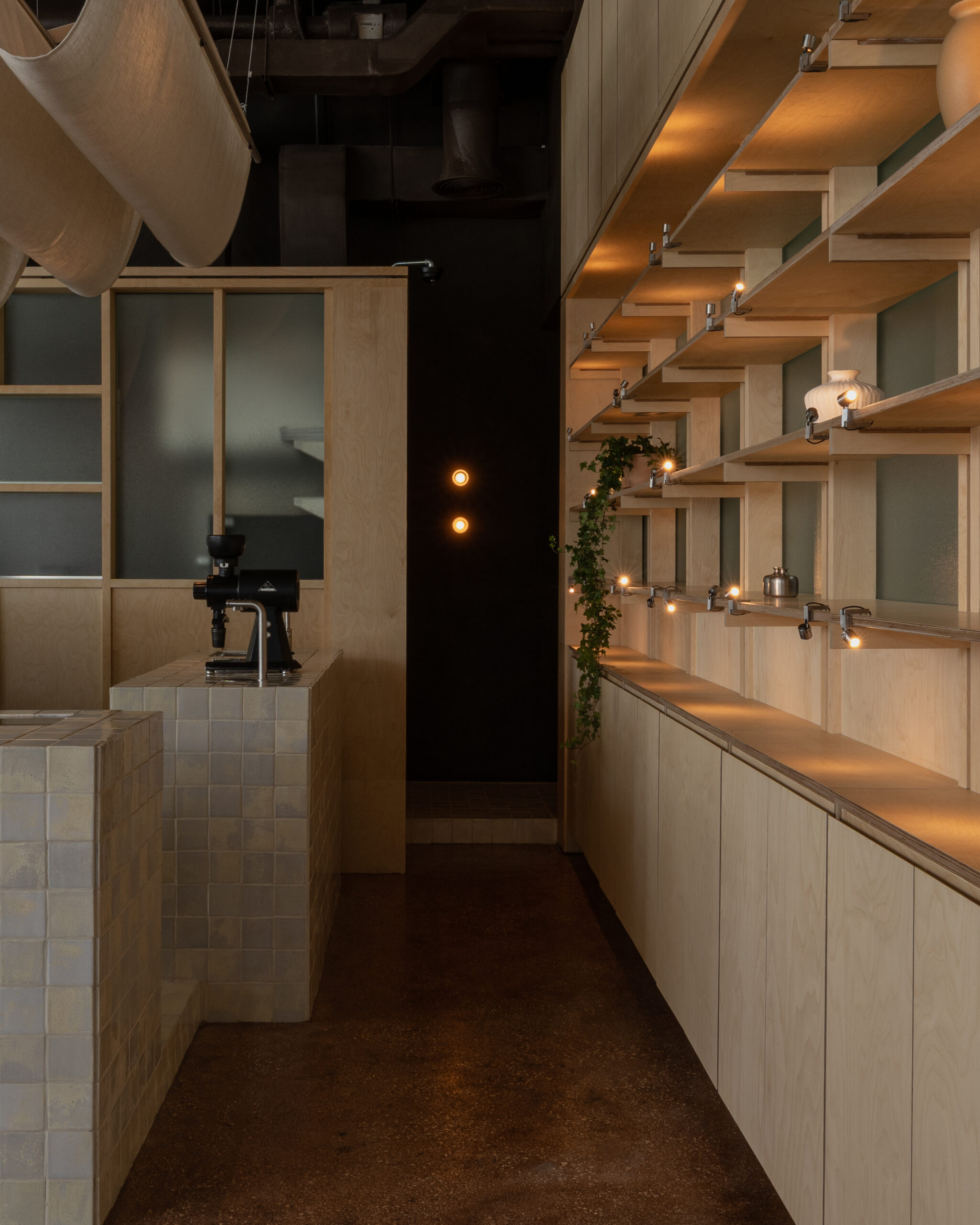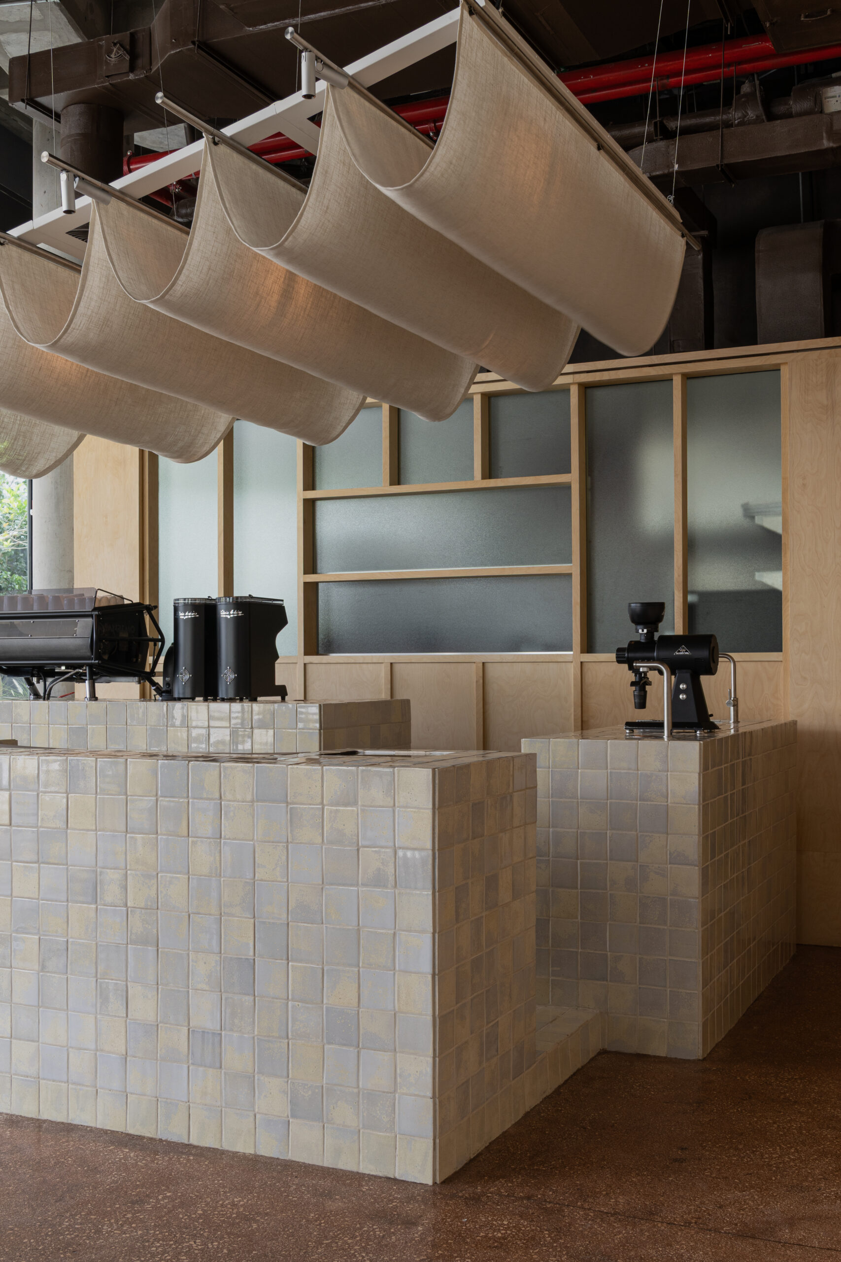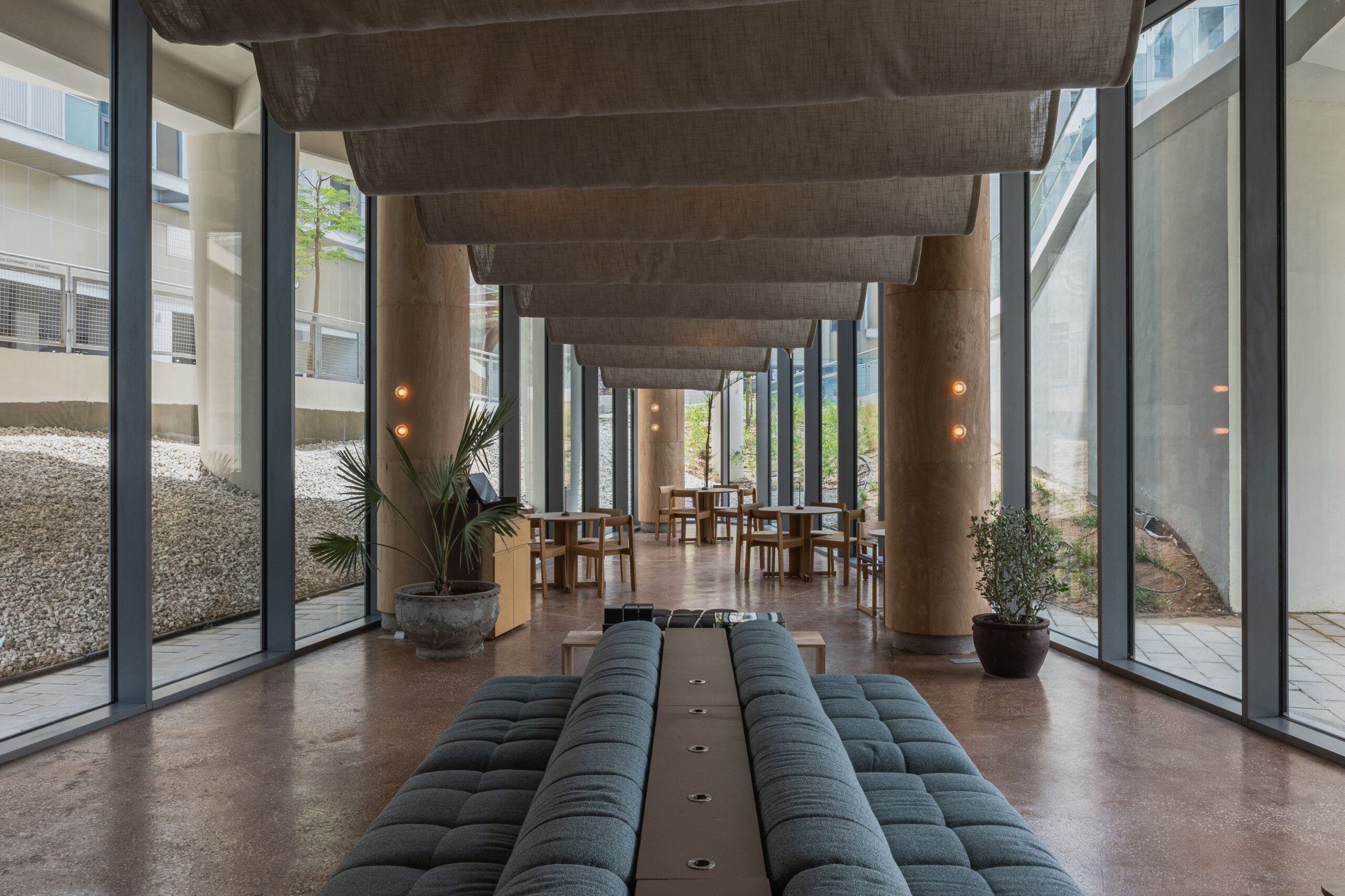 ETHR Clubhaus’s Abu Dhabi branch translates the brand’s minimal, artful DNA into a softer, coastal expression inspired by the capital’s island setting: a composition of scattered, connected “islands” from a tiled counter, crafted with local artisans and mother-of-pearl reference – to loose interactive seating, concrete floors with sandy aggregates, and translucent sail-like fabrics overhead lit by projections; warm, earthy tones punctuated by deep-sea blue and contrasts of solid forms with light fabrics and glow lighting create a calm, luminous space that feels crafted, effortless, and welcoming of community.